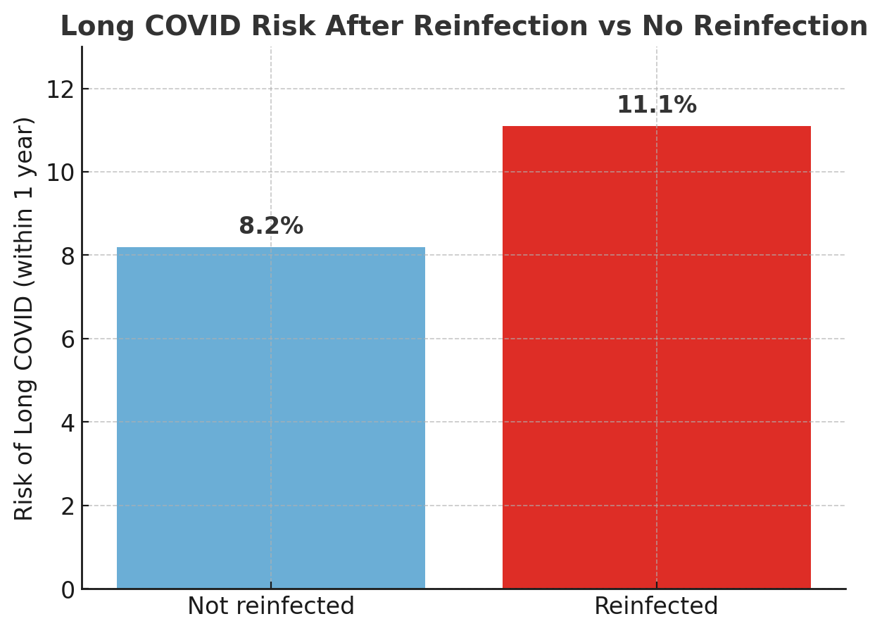It found that getting COVID again raises your risk of Long COVID by 35%. Now to clarify, it’s not saying you now have a 35% risk. It’s taking your existing risk and increasing it by 35%. If you have a low risk, that 35% applies to that.